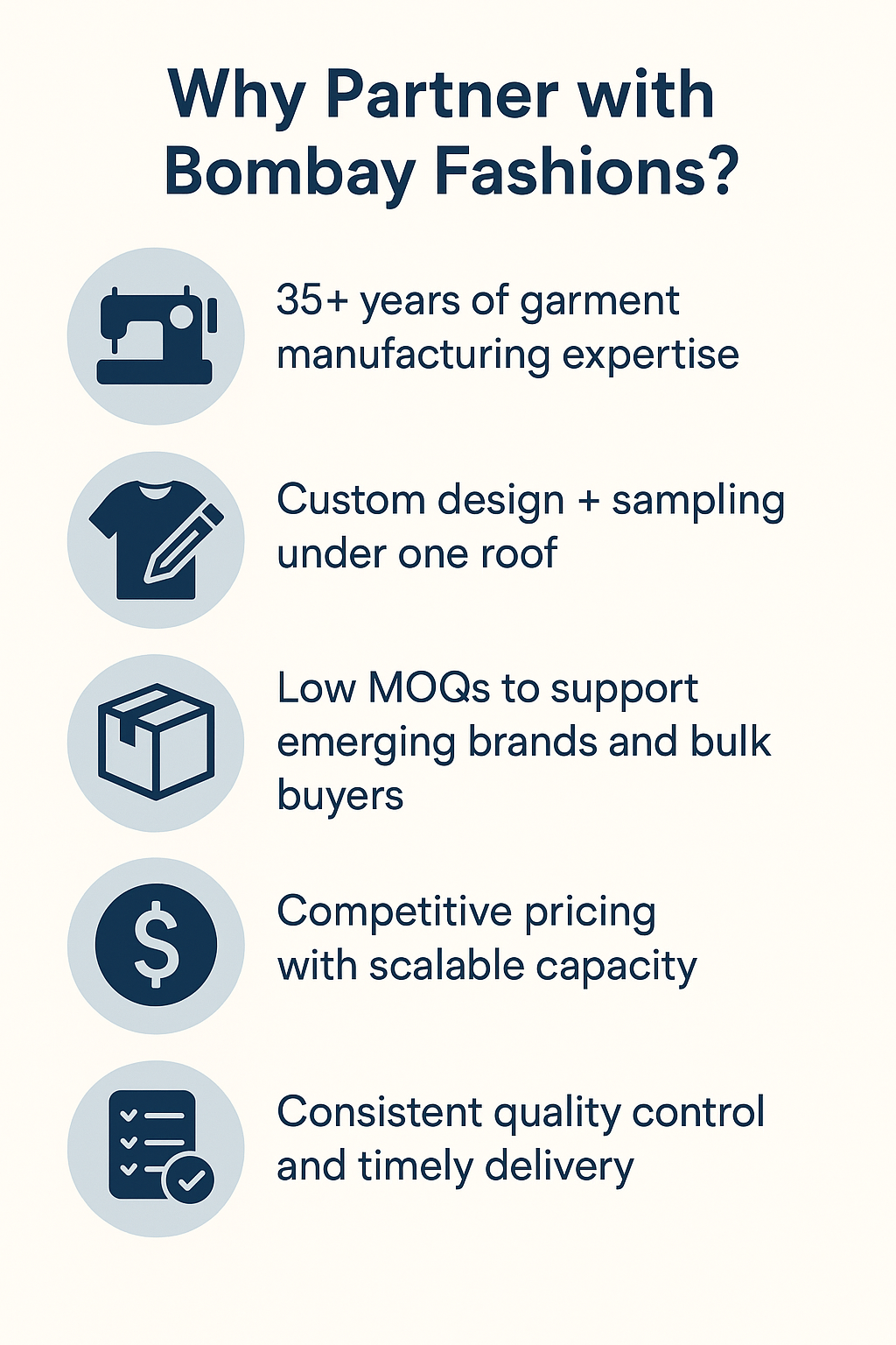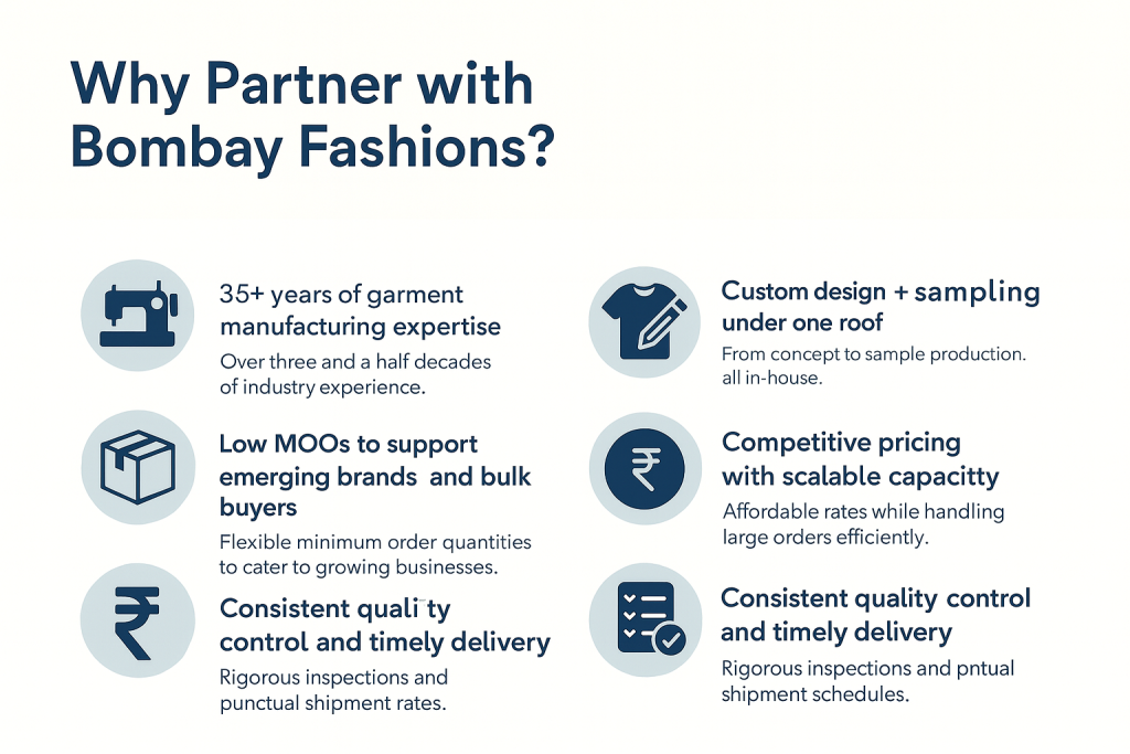 At Bombay Fashions, we combine decades of expertise with a forward-thinking approach to help bring your designs to life—efficiently, beautifully, and reliably. Let’s build something great together.