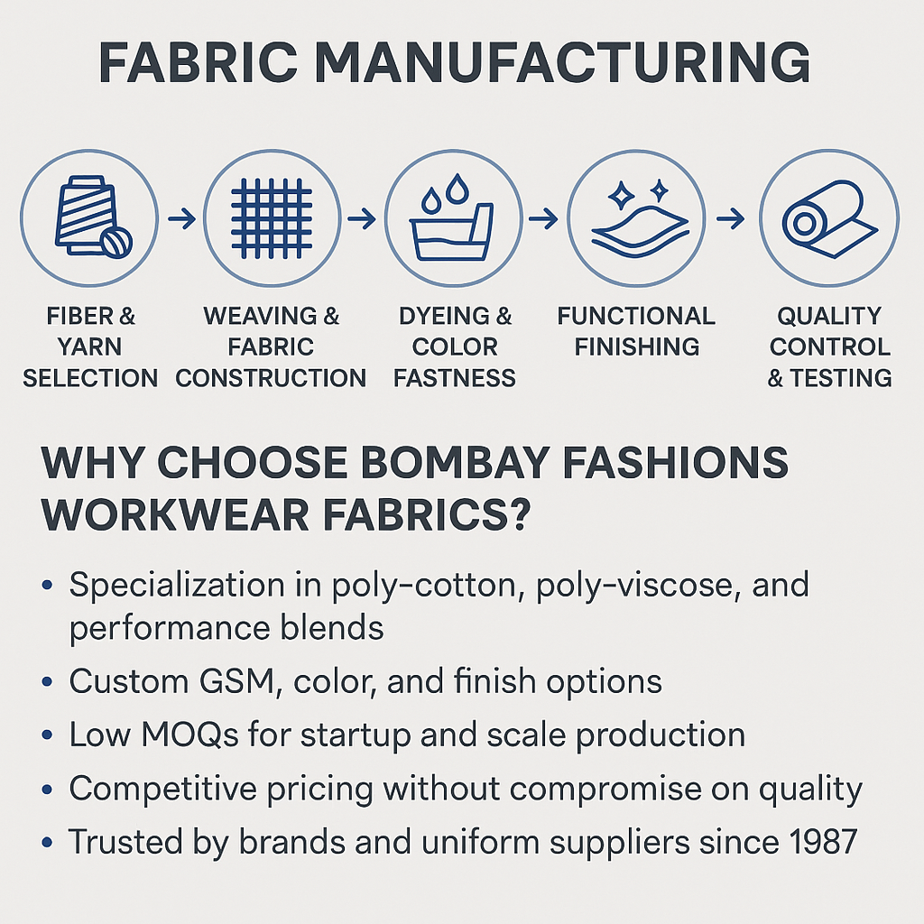 Engineered for Durability. Designed for Performance. At Bombay Fashions, we specialize in producing high-performance workwear fabrics that meet the demands of durability, comfort, and functionality. Our fabric development process focuses on blends such as poly-cotton, poly-viscose, and other performance-enhancing synthetics—designed to stand up to rigorous use across industries.