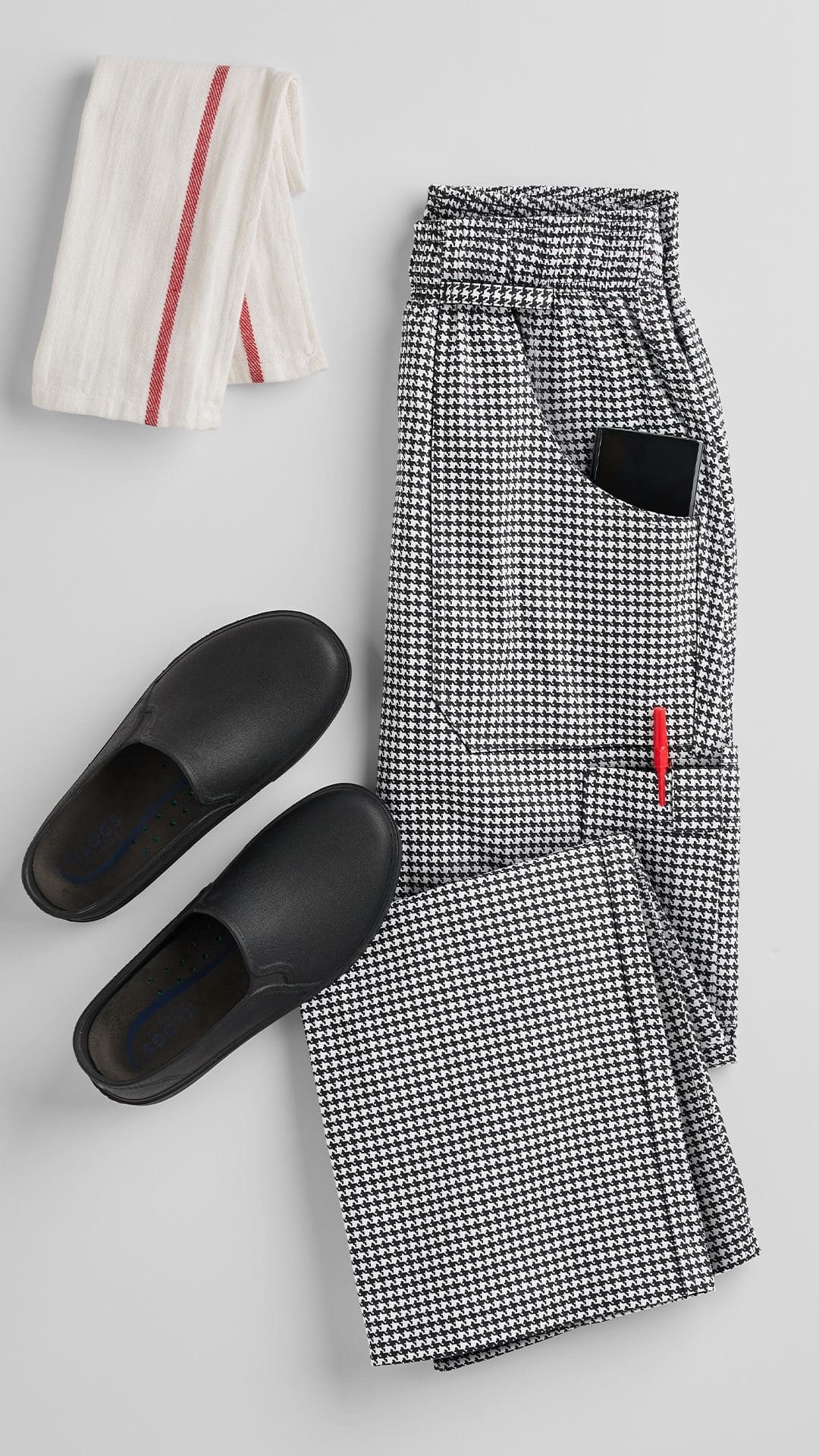 •  Chef Pants – Flexible waistband, durable fabric, available in solids and checks